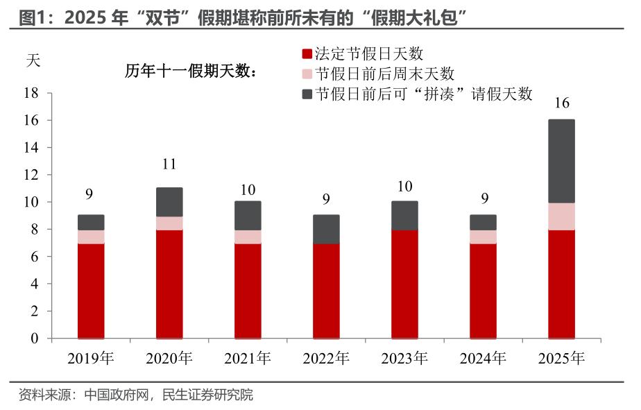 一是“拼长假”对于服务业消费的乘数效应充分体现。今年十一堪称前所未有的“假期大礼包”,即通过灵活的“双节重合”+“灵活调休”(上班族可以选择在节前、节后各请3天假)、使假期总天数达到16天,创下历史新高。