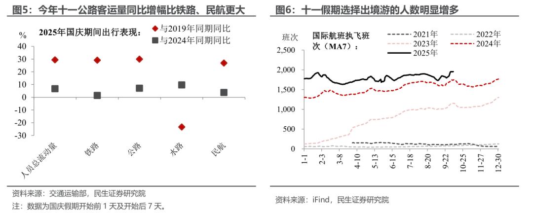 与此同时,居民旅游路径愈发“两极分化”。一极是“高频近程”的居住地周边游,体现“低成本、高满足”的理性消费观(今年十一假期公路客运量同比增幅比铁路、民航更大);另一极是“低频远程”的出境深度游,体现“靶向性奢侈”(今年十一假期前7日国际航班执飞班次相较于2024年同比增长了11.8%),即消费者更多是将钱花在“刀刃”上,为差异化体验支付溢价。这些现象再度体现了消费者理性的深化,体验经济将成为拉动内需的新引擎。