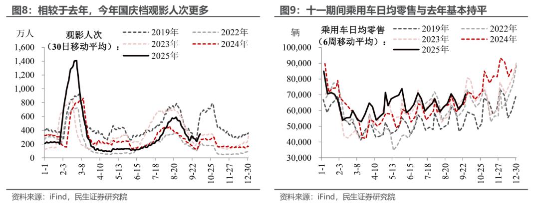 四是除了“体验感”,“性价比”也是居民消费决策的核心考量,体现在“买车不如观影”、“新房不如二手”等消费理念上。相较于2024年而言,今年十一乘用车销量表现平淡,而观影人次却明显更多。当然,这也与国庆档平均票价为近年来同期新低有一定关系。