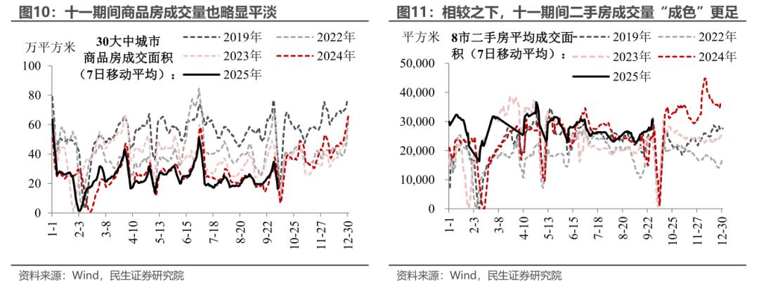 同时,十一期间延续了“二手大于新房”的态势。不仅今年乘用车销量“金九银十”的成色略显不足,房地产亦是如此。十一期间30大中城市商品房成交面积仍表现平淡,不过二手房市场“成色”更足,其成交量维持在历史同期较高位置。