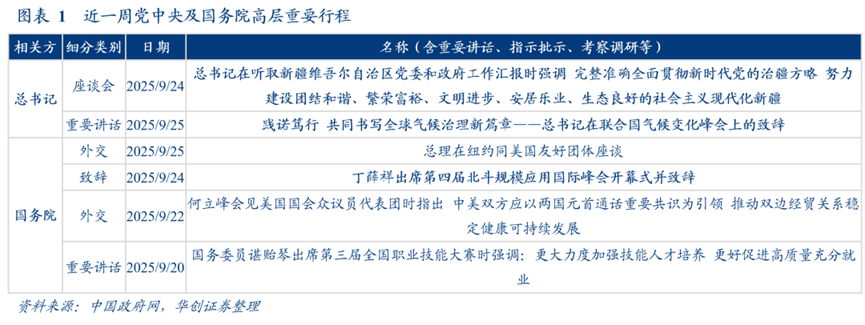 近一周(9月21日-28日),党中央及国务院高层重要行程,参见如下表格。