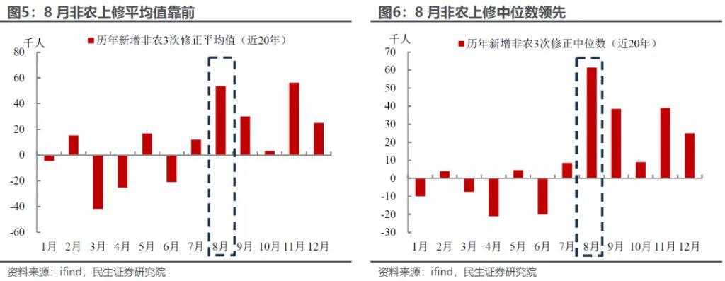 整体上修幅度也不容小觑,无论从中位数还是平均值来看,8 月非农后续上修幅度均位居全年前列。鉴于 7 月非农已出现上修迹象,结合白宫经济顾问哈塞特 " 就业报告或向上修正近 7 万个岗位 " 的暗示,8 月非农潜在上修对降息预期的影响不容忽视。
