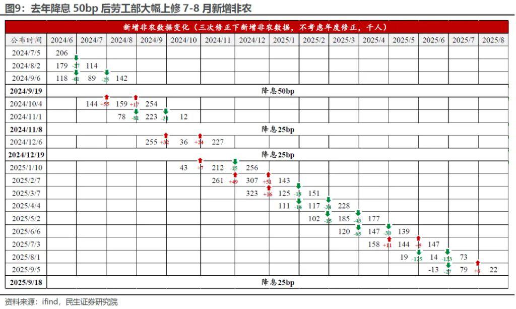 因此,8 月非农对降息预期的指引可能存在扰动,类似情形也曾在去年美联储首次降息前后上演:去年 6-7 月非农数据接连下修、失业率上行曾引发市场衰退恐慌,推动美联储 9 月降息,市场一度定价 11 月再降 50BP。但 10 月劳工部大幅上修 7-8 月非农数据,导致衰退叙事与 50bp 的激进预期降温。
