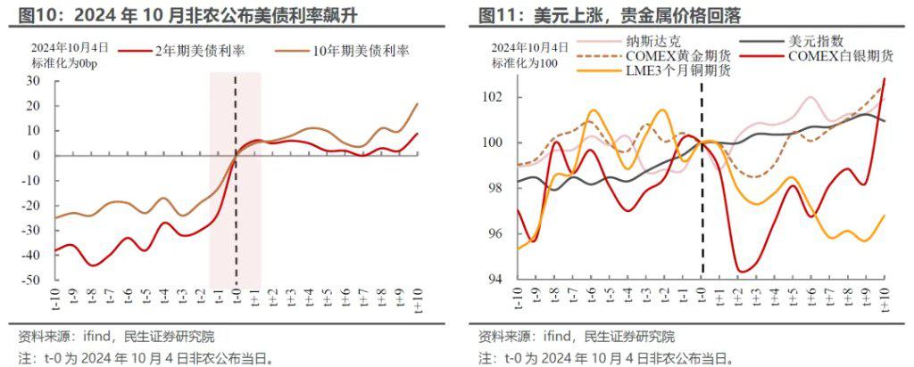 资产反映上,美债利率尤其是短端(2 年期)当日飙升约 20bp;美元上涨,金银铜等贵金属价格短期明显回调;美股短期小幅回落,但最终在衰退叙事的退坡和温和的降息助推下继续上涨。当然与上次不同的是,本轮资产定价更多来自于降息预期的押注,没有衰退叙事的参与,这也意味着非农上修对风险资产的负面影响可能更大。