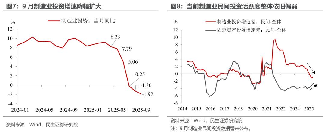 制造业:企业投资动能依旧偏弱。自4月美国加征关税以来,制造业投资同比增速便处于下行通道,9月降幅从8月的-1.3%进一步扩大至-1.9%。当前制造业民间投资活跃度虽呈现出小幅边际回暖态势,但整体依旧偏弱,反映出影响制造业投资增速的核心因素在于预期修复与信心恢复力度受限,无论是内部的有效需求不足、还是外部的贸易风波,短期内都会对企业投资动能形成压制。