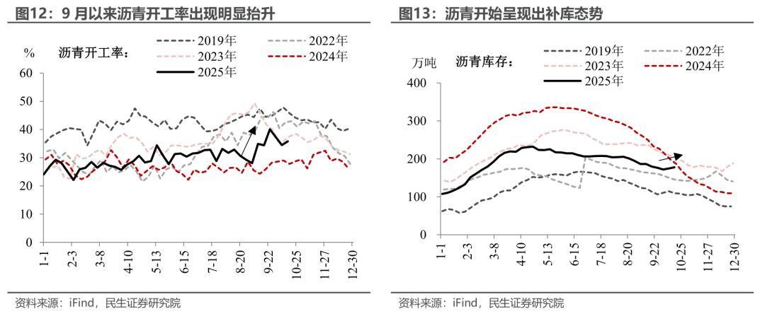 基建将是四季度经济的基石,同时发挥着协助新旧动能平稳转换的重要作用。放眼整个投资端,由于基建投资与私营企业紧密度相对更低、修复空间相对更大,因此其下行压力相对可控。无论是政策性金融工具的支持;还是近期中央财政安排结存限额下达地方的部分资金中,有一部分用于支持经济大省项目建设,都说明了“稳基建”逻辑依旧。从近期高频数据表现来看,无论是9月以来开始显著抬升的沥青开工率,还是开始迈入补库周期的沥青库存,都在表明基建项目开工情况正呈现出边际好转。